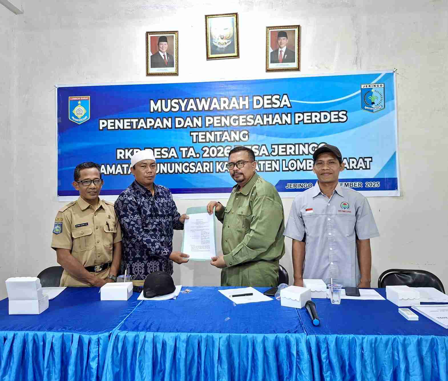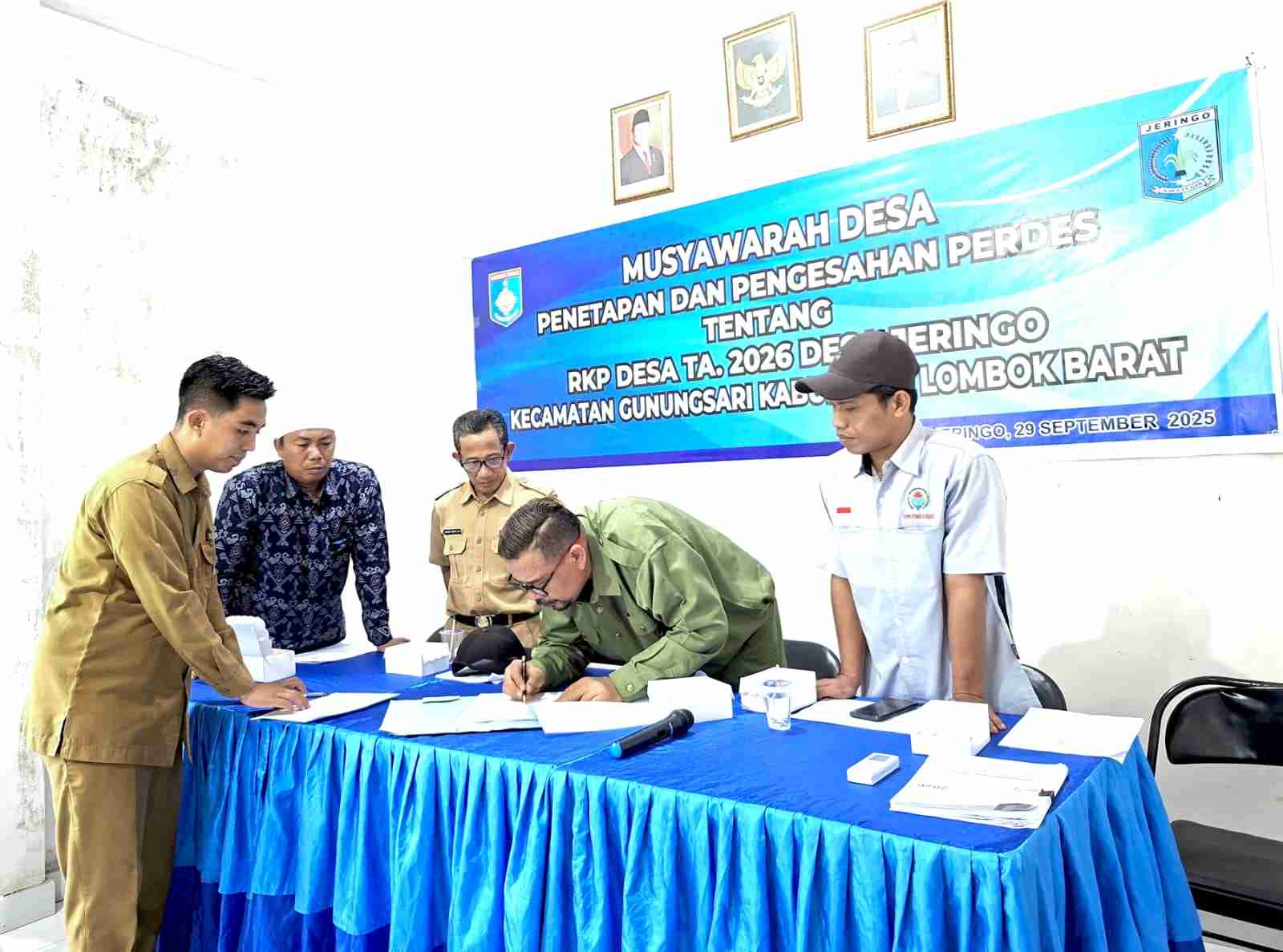 Sebagai puncak acara yang bersejarah, Ketua BPD Jeringo, H. Lalu Muhammad Athar, dengan mantap menetapkan rancangan Peraturan Desa (Perdes) tentang Rencana Kerja Pemerintah Desa (RKP) Tahun 2026. Sebagai bentuk pengesahan resmi atas penetapan tersebut, Kepala Desa Jeringo, Sahril, S.H., dan Ketua BPD Jeringo, H. Lalu Muhammad Athar, secara simbolis menandatangani berita acara penetapan rancangan Perdes, disaksikan oleh seluruh hadirin.